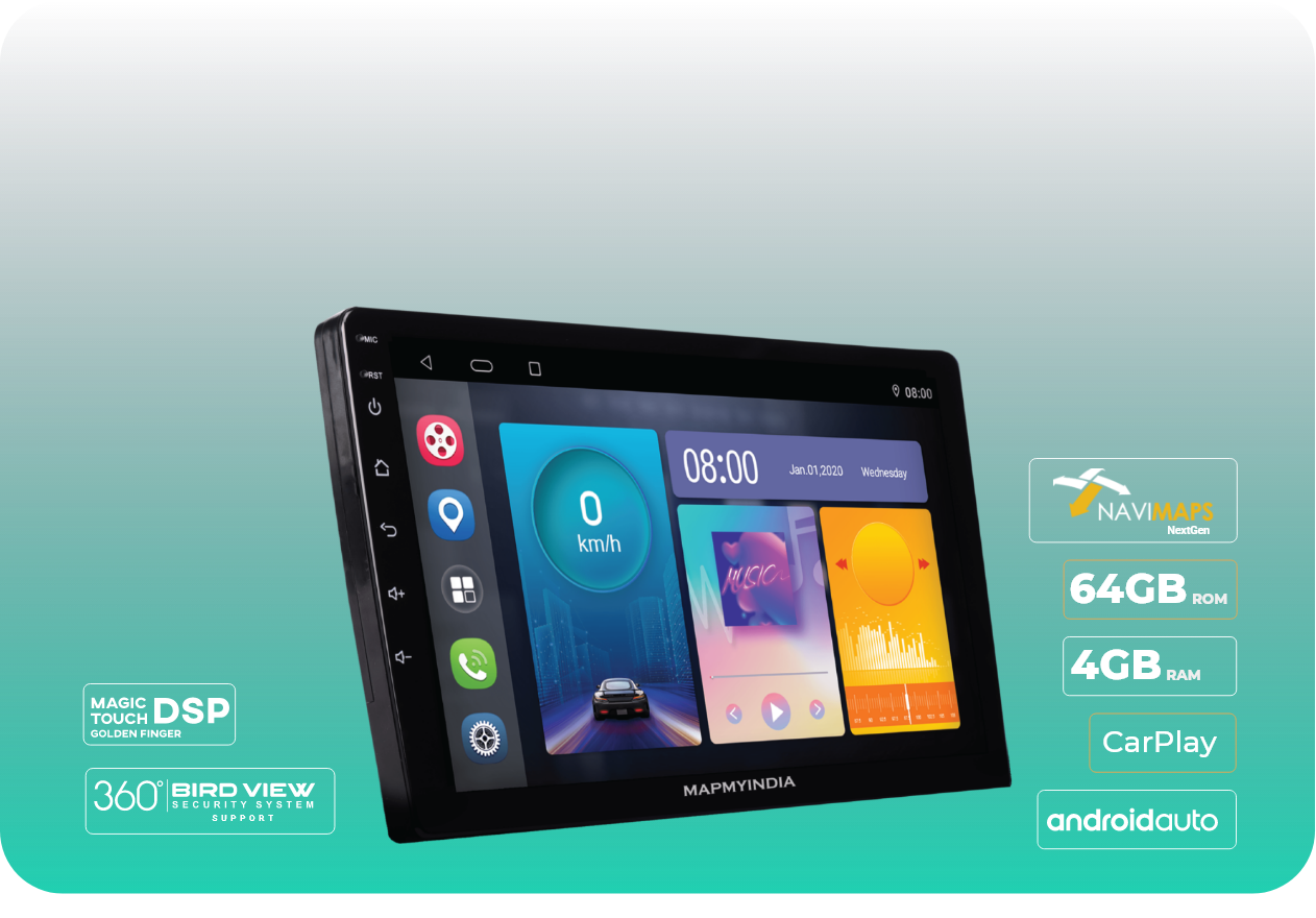 Elite Android-based Audio, Video, Offline & Online Navigation System with 64 GB Internal Memory, compatibility with CarPlay and Android Auto, built-in Play Store, WiFi Hotspot, and more from MapmyIndia.